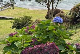 Though nearing the end of the season, the hydrangeas on Sao Miguel Island in the Azores are still blooming here and there. Planted by hand, they flank the roads as well as delineate borders throughout the vineyards. In the parks, their vibrant blue and enormous blossoms extend an invitation to pause for a moment, rest and take it all in. During a visit at “The Bay of Silence” I did just that; pausing to rest for a moment while taking in the beautiful surroundings.